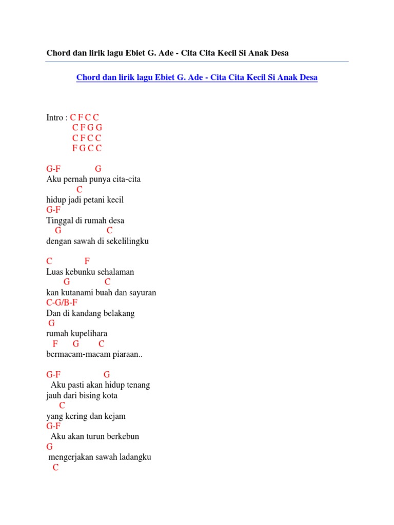 Chord Dan Lirik Lagu Ebiet G Ade Cita Cita Kecil Si Anak Desa
